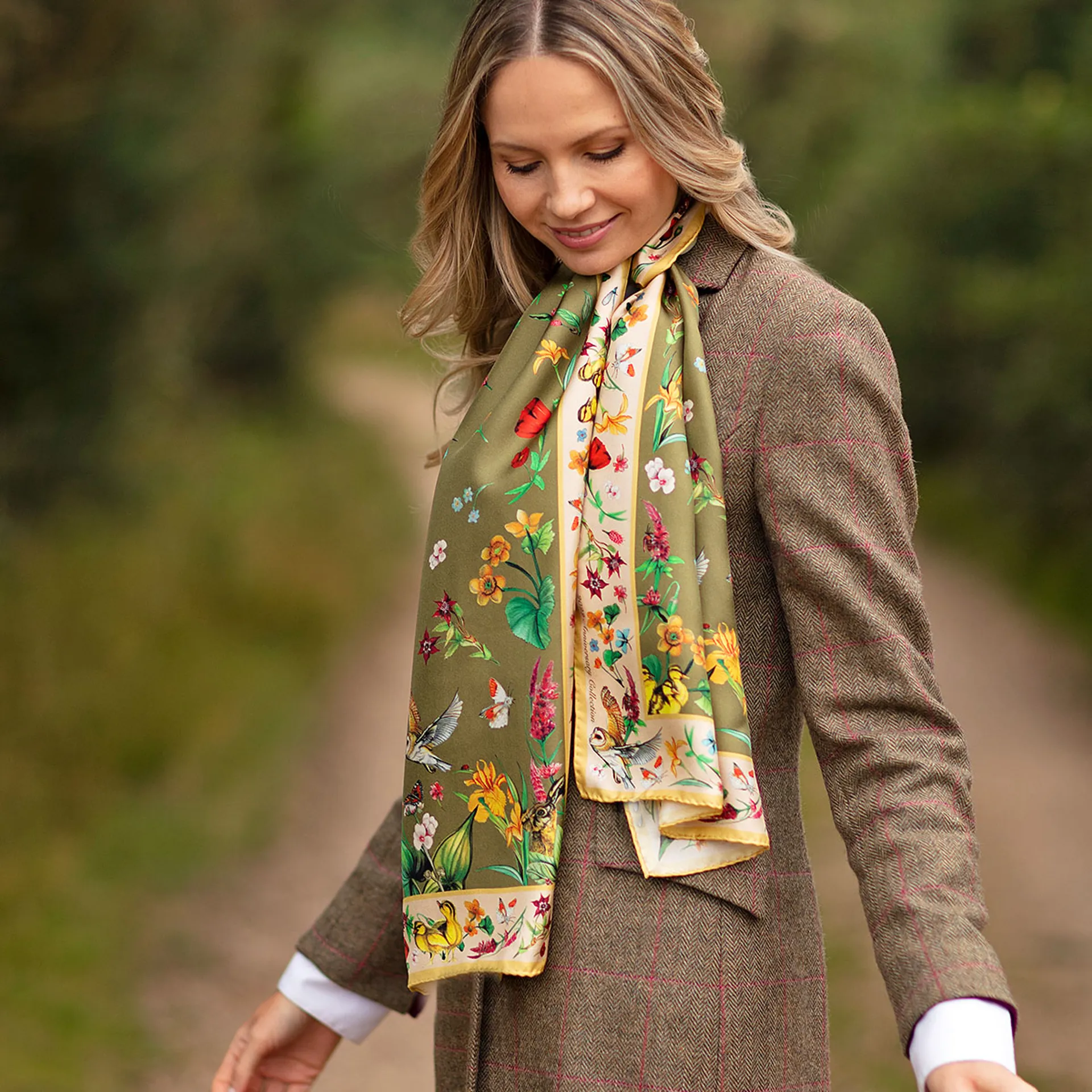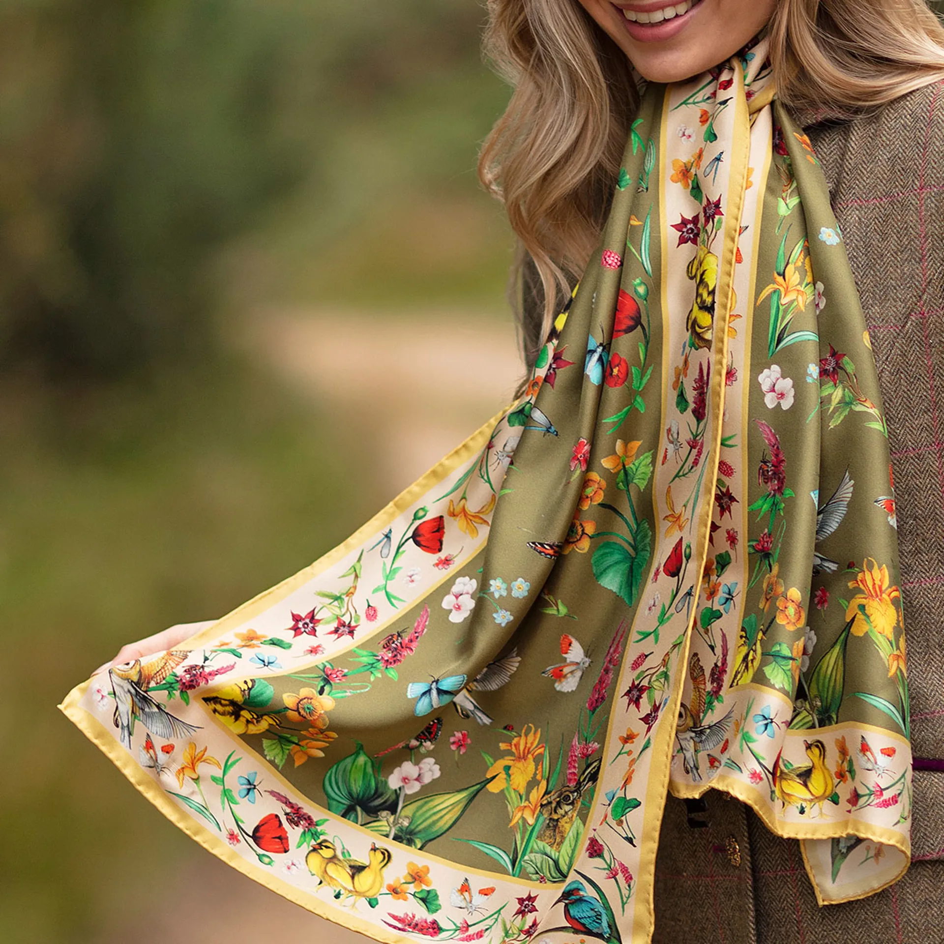 Question(s) answered about Clare Haggas Dreams Can Come True Classic Silk Scarf - Olive/Honey