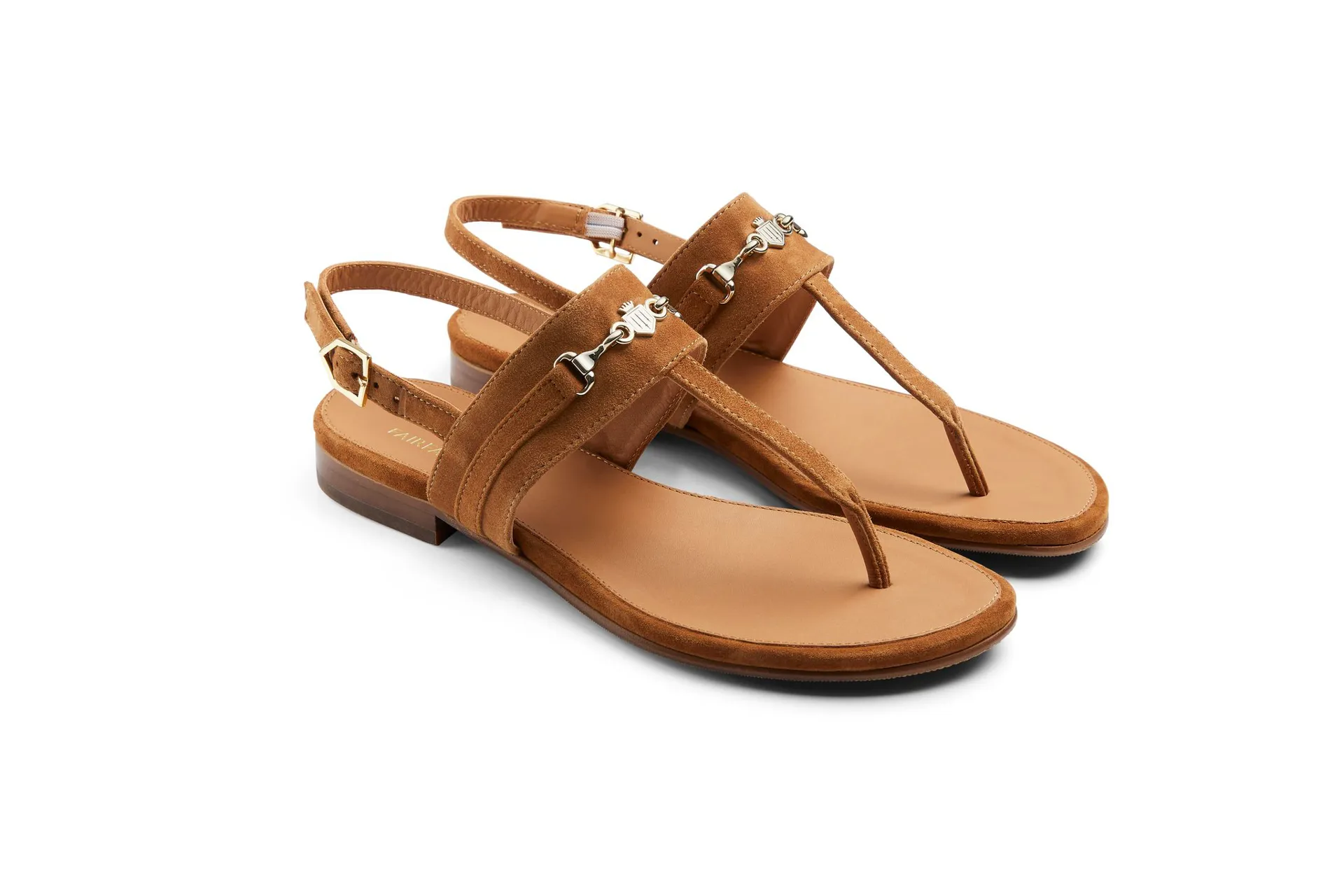 The Fairfax & Favor Thornham Sandals are sure to bring a touch of elegance to your warm-weather outfits. Crafted from suede and embellished with the Fairfax & Favor gold bit hardware. Featuring an adjustable strap and gold chevron buckle. The leather lined padded insole provides extra comfort with a rubber and leather sole for durability.